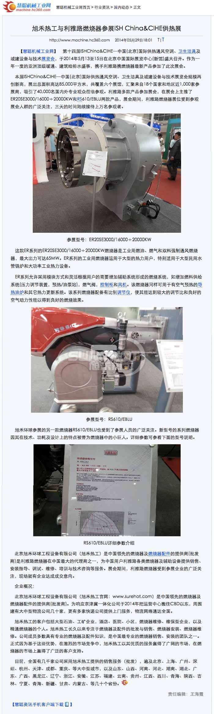 第十四屆ISHChina&CIHE─中國(北京)國際供熱通風(fēng)空調(diào)、衛(wèi)生潔具及城建設(shè)備與技術(shù)展覽會(huì),于2014年5月13至15日在北京中國國際展覽中心(新館)盛大召開。作為一年一度的亞洲頂級(jí)暖通、建筑給排水盛事,攜手利雅路攜燃燒器比較新產(chǎn)品參加了此次展會(huì)。