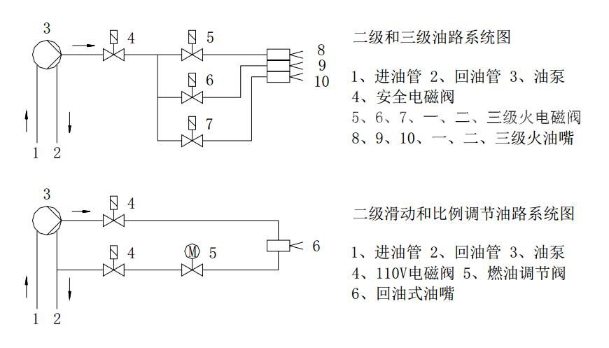 燃料系統的功能在于保證燃燒器燃燒所需的燃料。燃油燃燒器的燃料系統主要有:油管及接頭、油泵、電磁閥、噴嘴、重油預熱器。燃氣燃燒器主要有過濾器、調壓器、電磁閥組、點火電磁閥組。