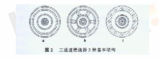 從上述分析中可知,增加一次射流的旋流數(shù)將提高一次射流的引射速率,即煤粉和二次風(fēng)的混合速率,從而強(qiáng)化了窯頭煤粉燃燒,使火焰變得粗短,所以旋流系數(shù)又被稱之為火焰形狀系數(shù)。實(shí)際上燃燒器噴嘴結(jié)構(gòu)形式和參數(shù)的變化也明顯地影響火焰的形狀。從空氣動力學(xué)的角度簡單地理解,一次射流對二次風(fēng)的引射量取決于一次射流的動量通量,其引射速率除受一次射流角動量通量控制外,一次射流和二次風(fēng)的接觸面積(以水力半徑度量)顯然對引射速率有較大影響,因?yàn)橐涫峭ㄟ^射流股和周邊二次風(fēng)接觸而上的動量交換而產(chǎn)生的。噴嘴設(shè)計(jì)中,在保持噴嘴出口截面積不變情況下減小水力半徑,即增加射流股和二次風(fēng)的接觸面積,將增加煤粉和二次風(fēng)的混合速率,使火焰變得粗短;另一方面也由于過高的二次風(fēng)混入速率使一次射流股的核心速度衰減過快,表現(xiàn)為火焰“剛度”下降,對窯內(nèi)的穿透深度減小。筆者曾就當(dāng)時市面上的三通道煤粉燃燒器歸納成3種基本結(jié)構(gòu)形式,見圖2。其中在相同的一次凈風(fēng)總的出口截面積情況下,c型對二次風(fēng)的引射速率高于a型,實(shí)踐中前者火焰粗短,燃燒劇烈,較適合于強(qiáng)化煅燒情況。b型中煤粉通道被分割成數(shù)個流股,由于煤粉通道介于內(nèi)風(fēng)和外風(fēng)通道之間,因而增加了煤粉對一次風(fēng)的混合能力。筆者認(rèn)為,這種結(jié)構(gòu)形式可能對燃燒速率影響不大,實(shí)踐中我國在300t/d、600t/d的預(yù)熱器窯上使用較多,普遍認(rèn)為火焰散,有時甚至出現(xiàn)所謂的“鷹爪型”火焰,這種不利現(xiàn)象可以通過適當(dāng)減小煤粉通道的動量通量得以改善。