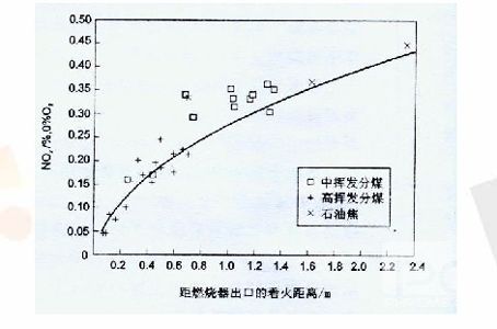 我國目前水泥回轉(zhuǎn)窯的Nox排放量大都超過0.1%,高的超過0.2%,而一些先進(jìn)國家已控制在0.02%-0.04%以下。燃燒過程中Nox排放分3種類型,即熱力Nox排放、燃料Nox排放和催化Nox排放,三者與燃燒溫度的關(guān)系見圖3。由于窯頭火焰溫度高達(dá)1800℃左右,熱力Nox占主要地位(當(dāng)燃料中含有碳?xì)浠衔飼r,會在較低溫度下出現(xiàn)催化Nox排放)。減少窯頭Nox排放的主要途徑在于一方面應(yīng)盡量降低火焰的峰值溫度,避免局部高溫,這往往和強(qiáng)化燃燒概念相矛盾,需要對火焰各階段的二次風(fēng)混合速率進(jìn)行控制;另一方面應(yīng)控制局部氧濃度,特別是對燃燒器出口至著火這一階段的氧濃度控制。圖4中高揮發(fā)分煙煤、中等揮發(fā)分煙煤和石油焦的著火溫度依次升高。在相同受限射流火焰中,三者距燃燒器出口的著火距離依次是石油焦>中等揮發(fā)分煙煤>高揮發(fā)分煙煤,其Nox排放量大小依次是石油焦>中等揮發(fā)分煙煤>高揮發(fā)分煙煤。