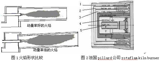 回轉(zhuǎn)窯中作為噴射器的燃燒器,其目的是為了盡可能利用來自于冷卻器的二次風使得燃料燃燒盡可能接近二次風聚集的窯中線。這就解釋了為什么燃燒器的動量決定了火焰的形狀。更高動量意味著更快的混合和更短更熱的火焰。
