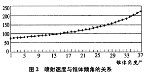 (6)各風道頭部錐體的角度是噴煤管設計的關鍵,在一次風一定的情況下,參數的大小直接影響燃燒器的動量范圍,與噴射速度有直接關系。圖2顯示了2500t/d級回轉窯窯頭燃燒器軸流風速與錐度的關系。